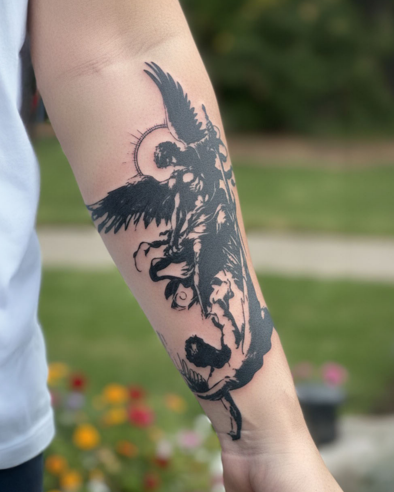 A mighty angel with wide wings and a glowing halo strikes down a fallen figure below. Holding a staff, the angel shines in bold gothic style, showing the triumph of light over darkness.
