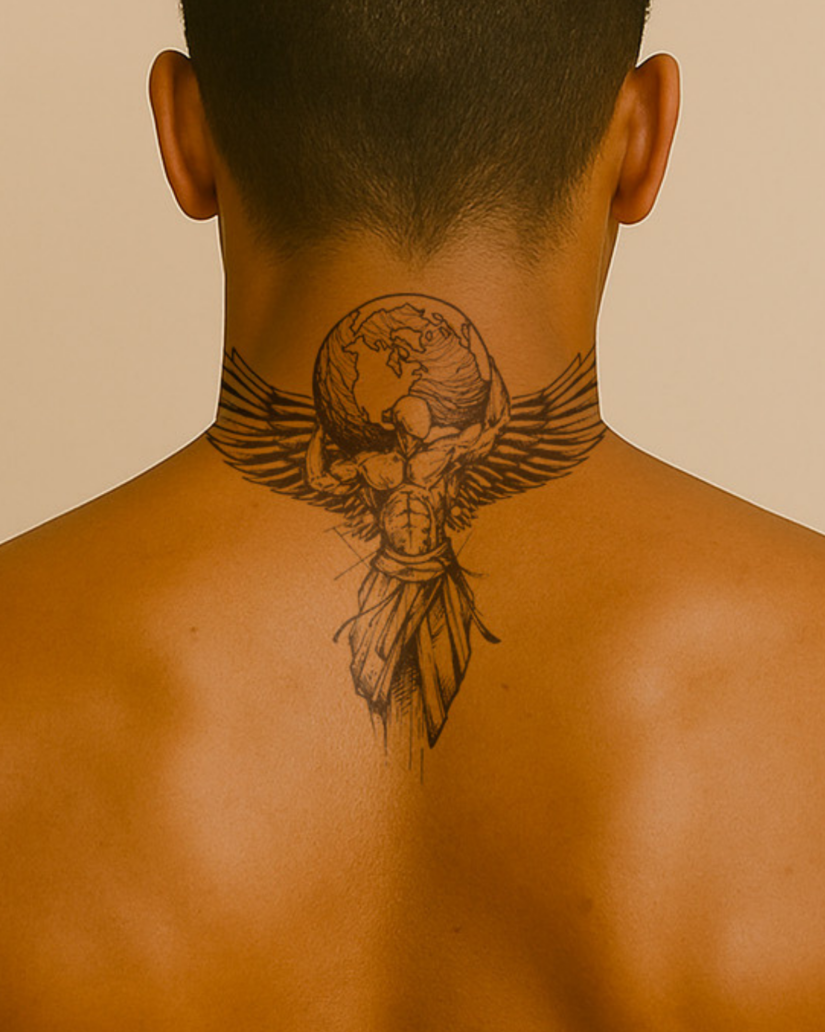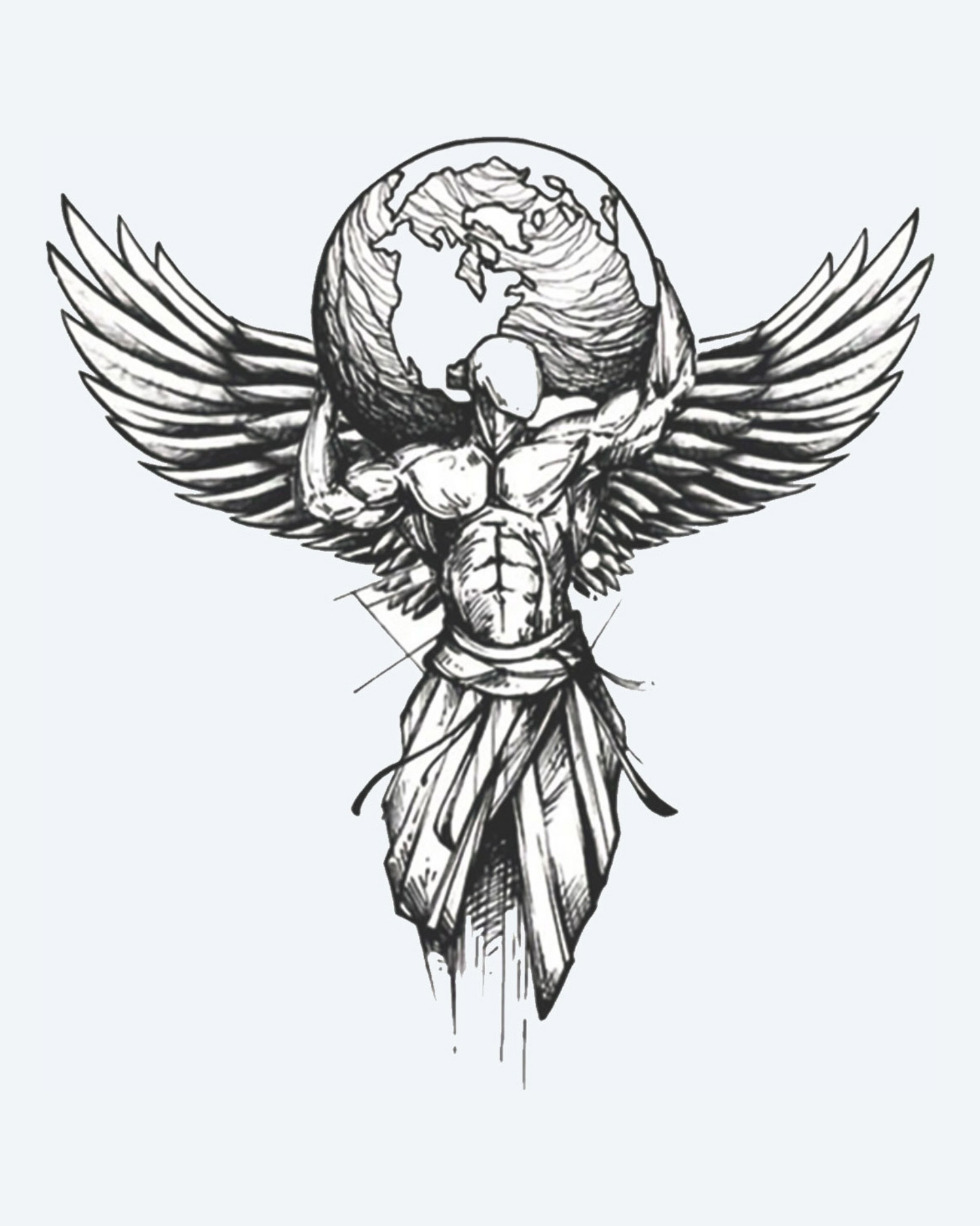 This powerful tattoo depicts a muscular, winged figure carrying the weight of the earth on her shoulders. Dressed in a flowing robe and adorned with bold lines, this design symbolizes strength, sacrifice, and divine duty, where myth meets celestial protection.