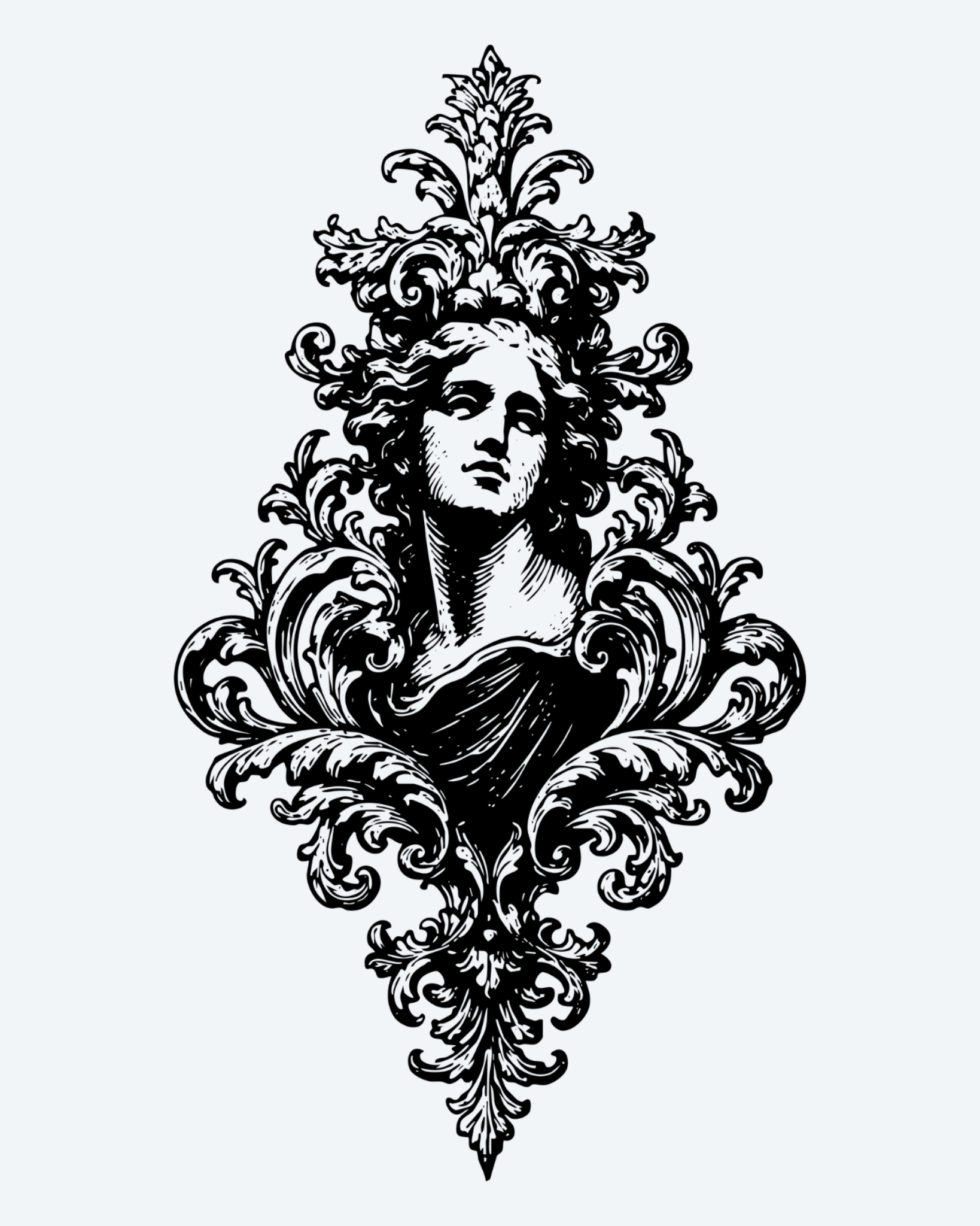 An ornamental blackwork tattoo of a graceful woman’s face framed by swirling baroque patterns. It tells a story of beauty and elegance, like a timeless statue brought to life in flowing art.