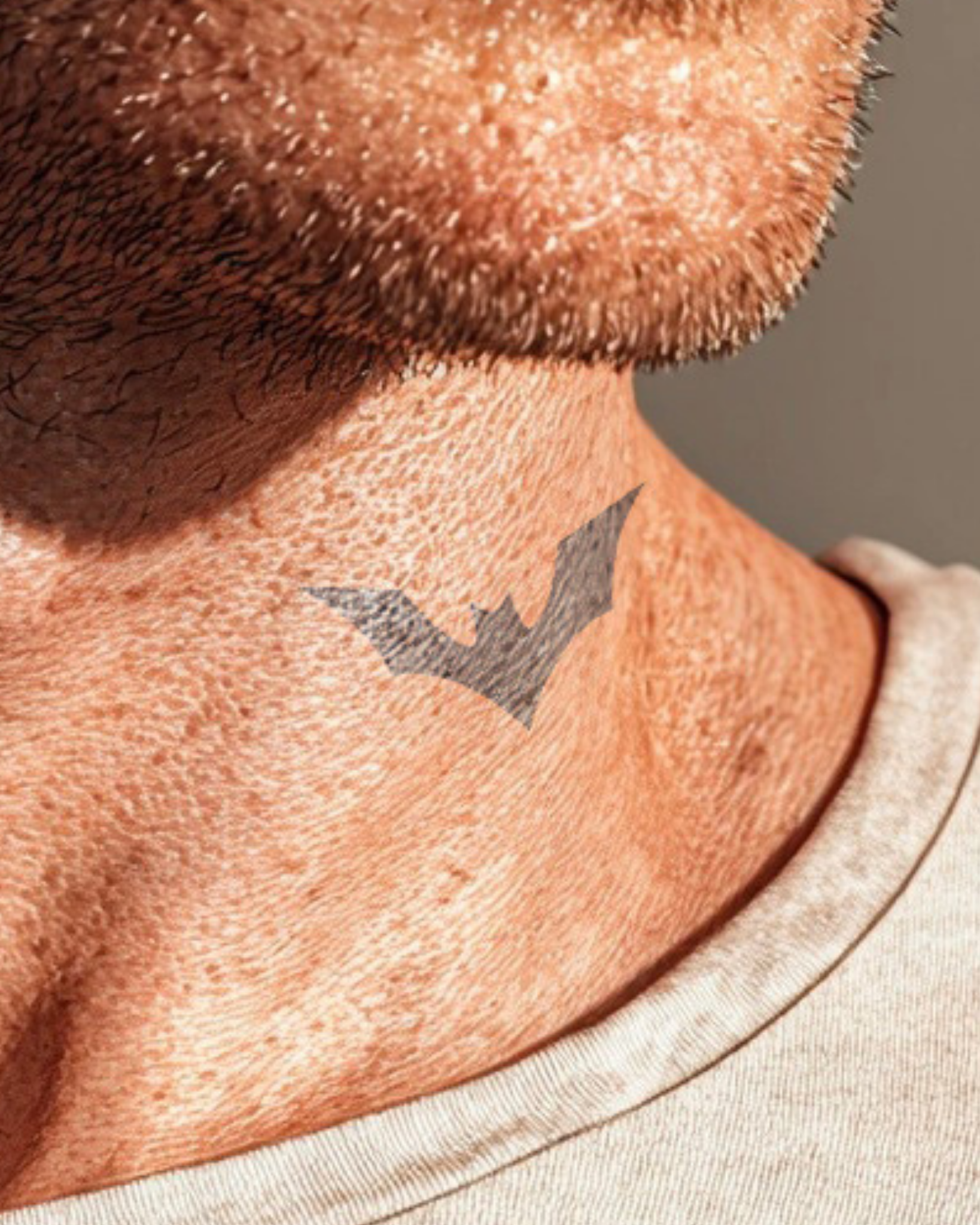 A simple bat silhouette, bold and sharp. This tattoo symbolizes mystery, freedom, and nocturnal energy, perfect for those who find strength in the darkness.