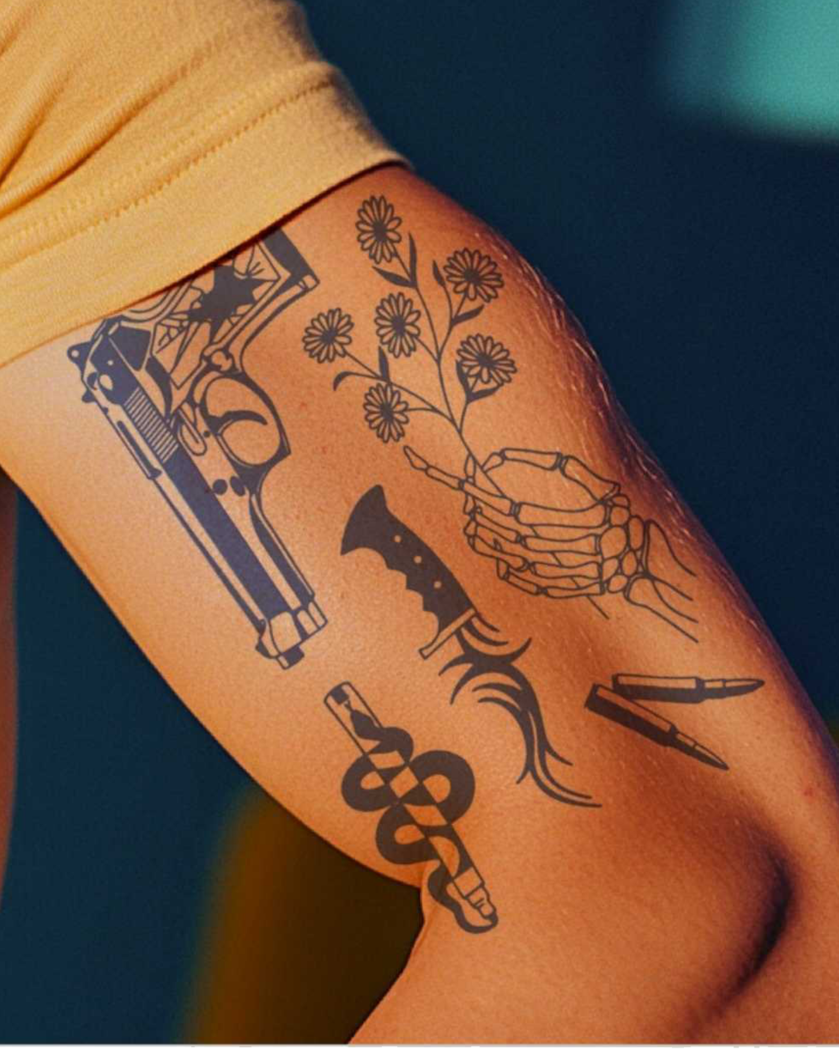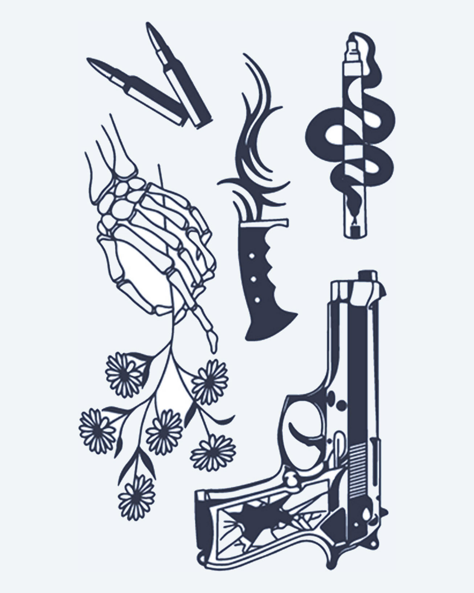 A bundle of contrasting symbols: a pistol, a knife, a skeleton hand, a snake, a flower bouquet, and a bullet. These designs represent the balance of life and death, danger and beauty, capturing both elegance and raw power.