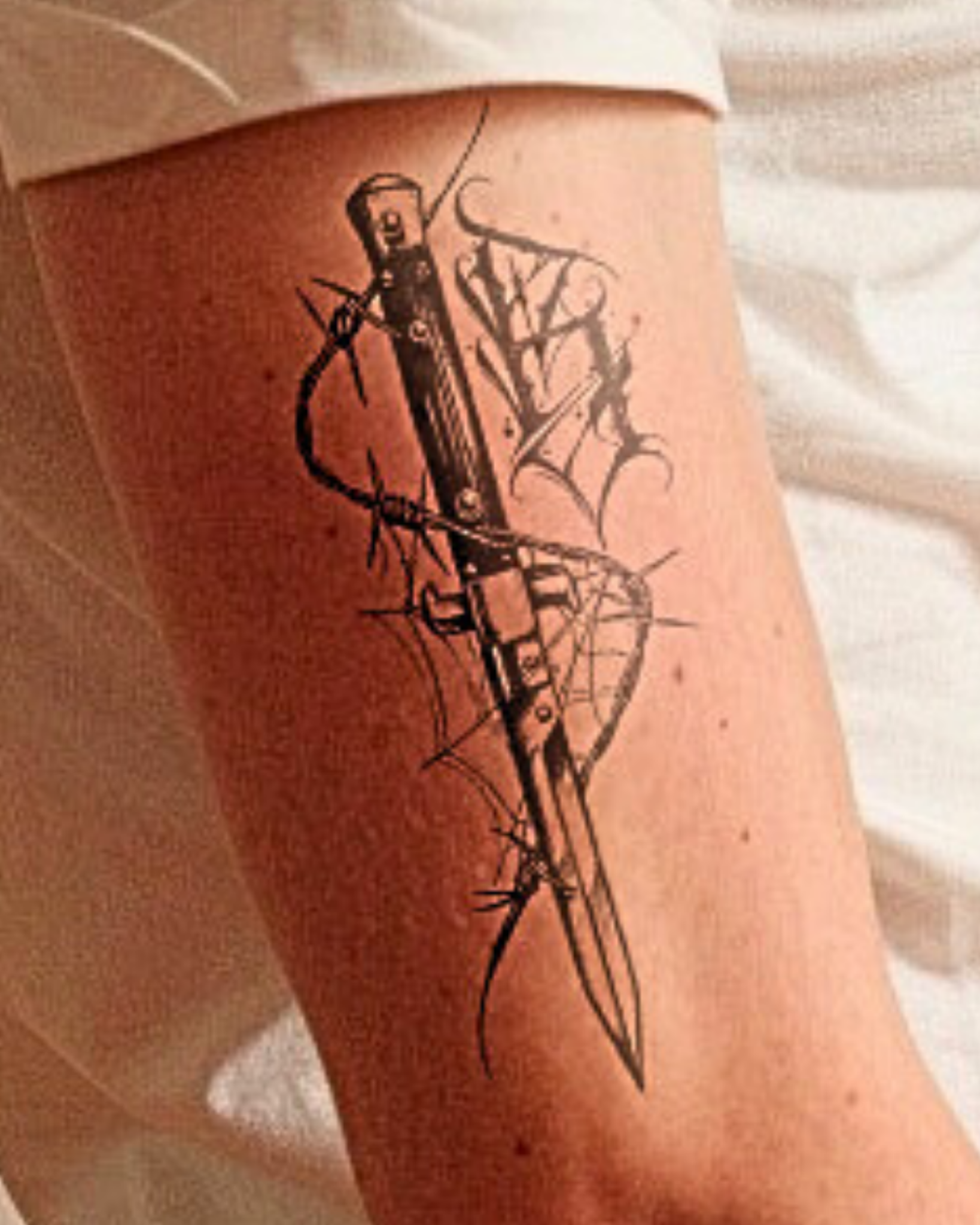 This striking tattoo depicts a detailed switchblade entwined with barbed wire and cobwebs, accompanied by gothic lettering. It evokes themes of danger, imprisonment, and survival, where sharp edges meet the delicate threads of time and fate.