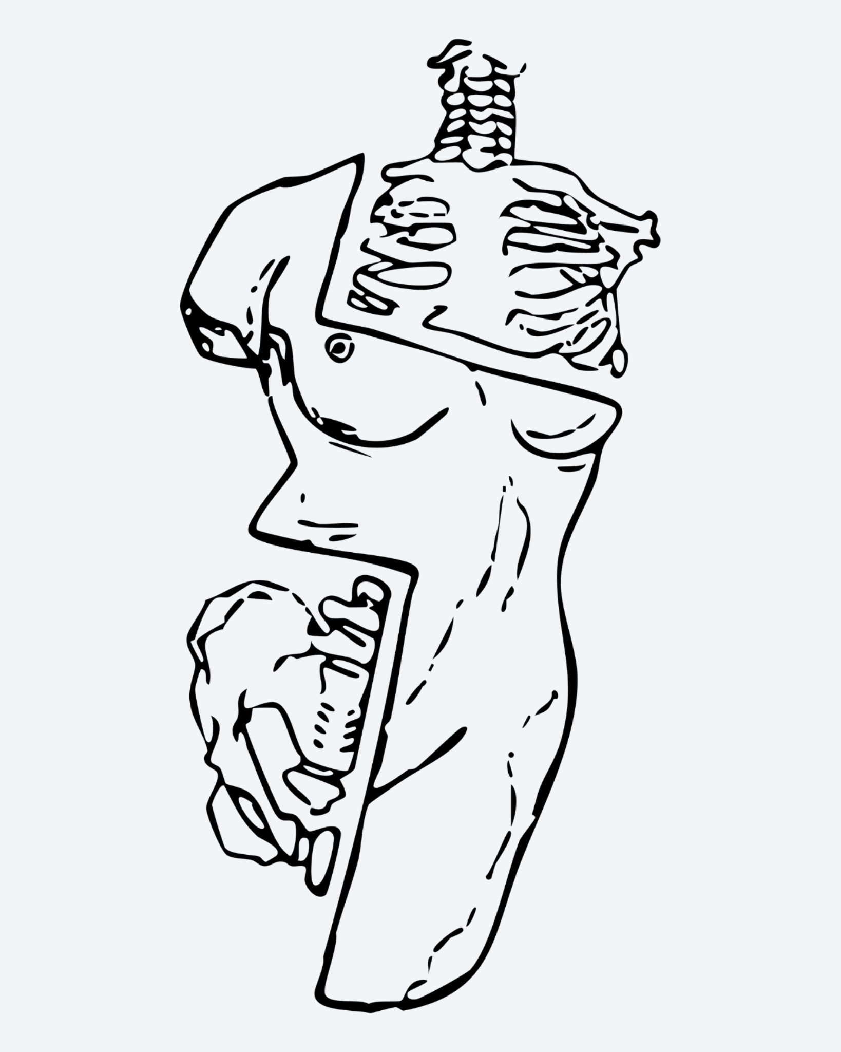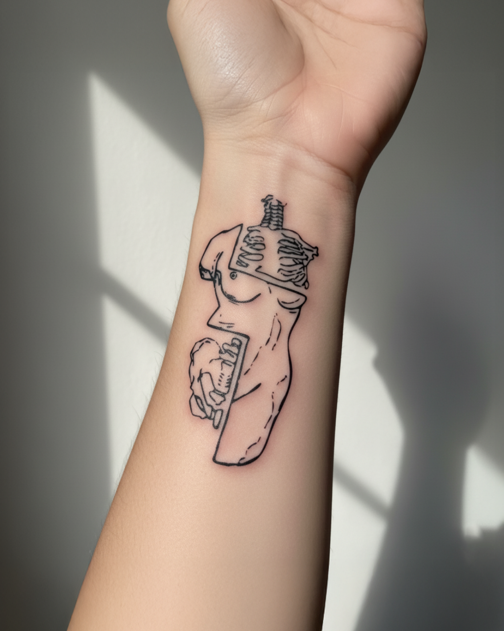 A surreal line-art tattoo of a human torso split into puzzle-like pieces, showing bones, muscles, and hands inside. It tells a story of how the body is made of many hidden parts fitting together.