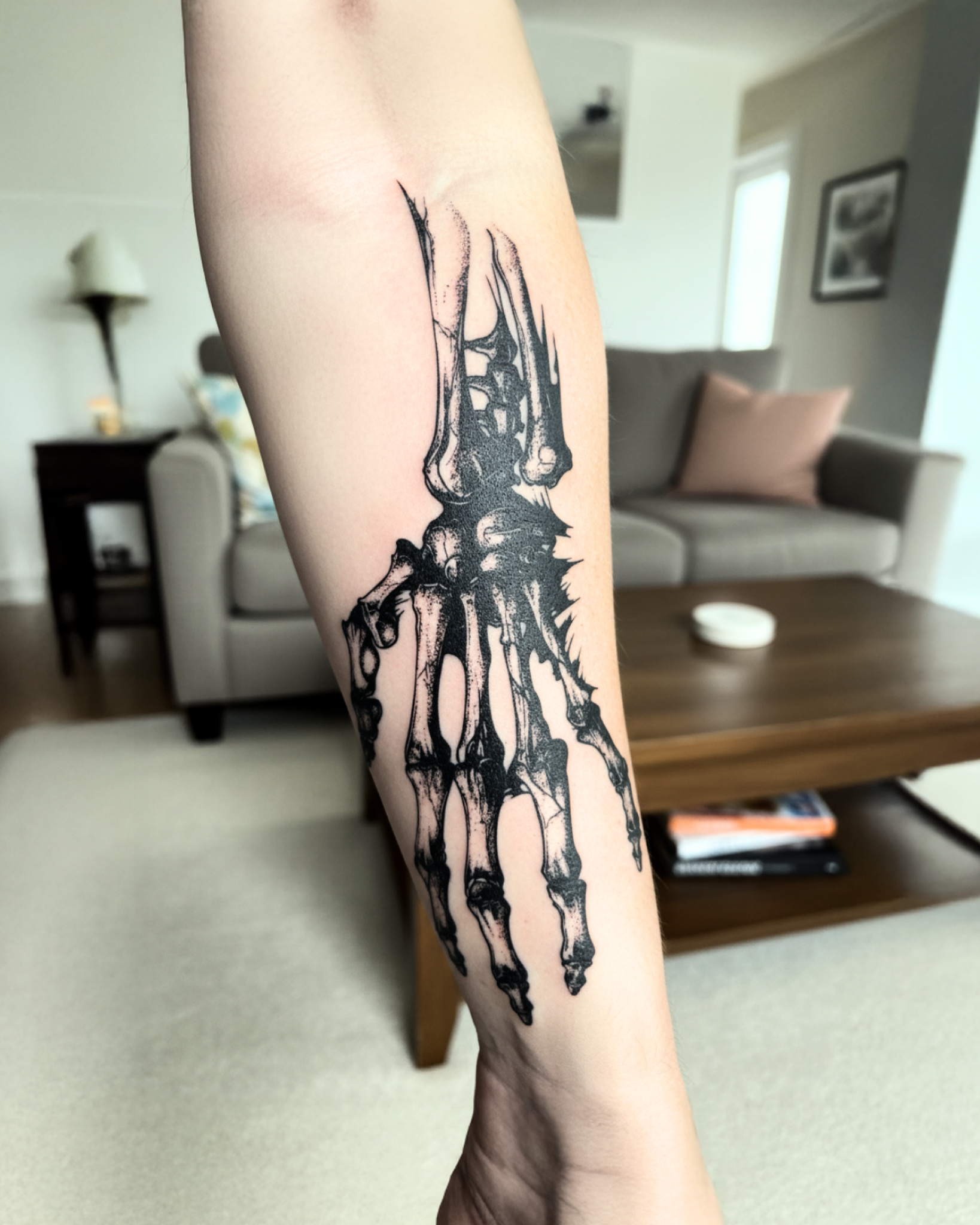 A skeletal hand reaches out with sharp, cracked bones and dark shadows. This blackwork tattoo shows death’s touch — strong, cold, and timeless, like a hand from beyond.