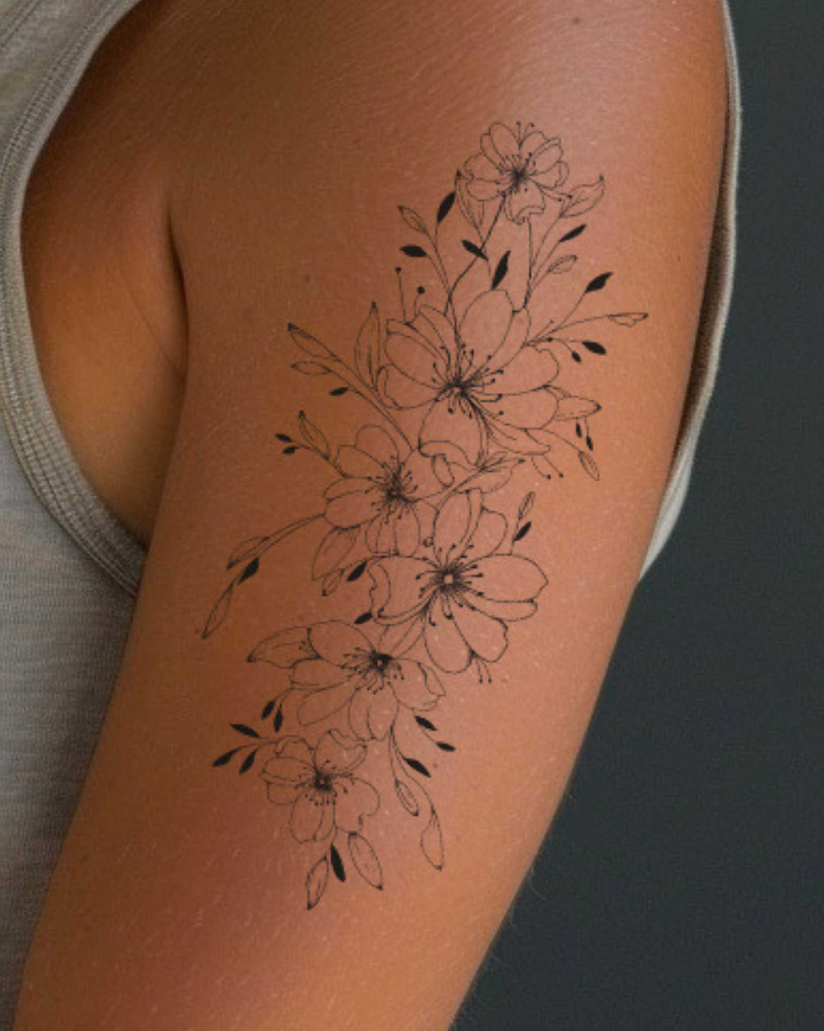 An elegant tattoo featuring finely drawn cherry blossoms gently forming a vertical vine. The delicate lines, delicate buds, and harmoniously arranged leaves lend the motif a poetic, timeless beauty.