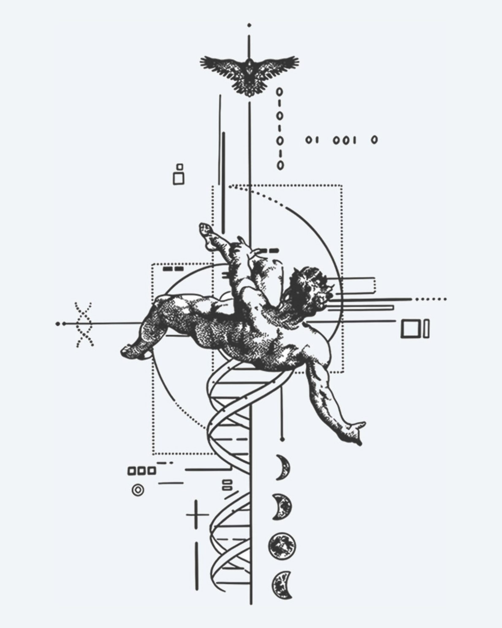This design is a fusion of classical art and futuristic symbolism. It depicts a muscular figure intertwined with a DNA helix, surrounded by geometric patterns, moon phases, and binary code. It explores the intersection of creation, science, and cosmic destiny.