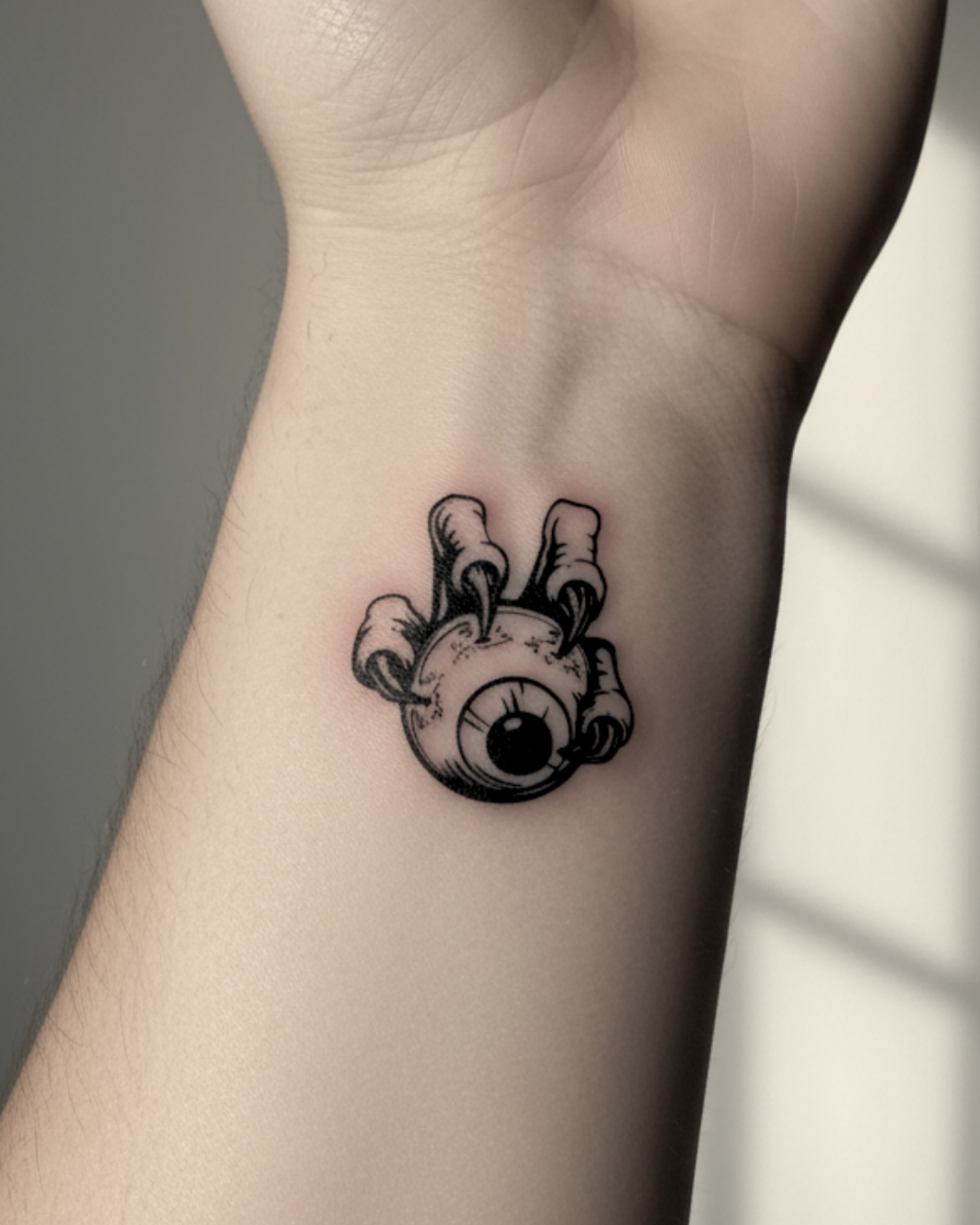 A creepy claw gripping an eyeball, full of etched line detail. Bold blackwork with a retro horror feel — edgy and attention-grabbing. Ideal for statement placement on the forearm or chest.