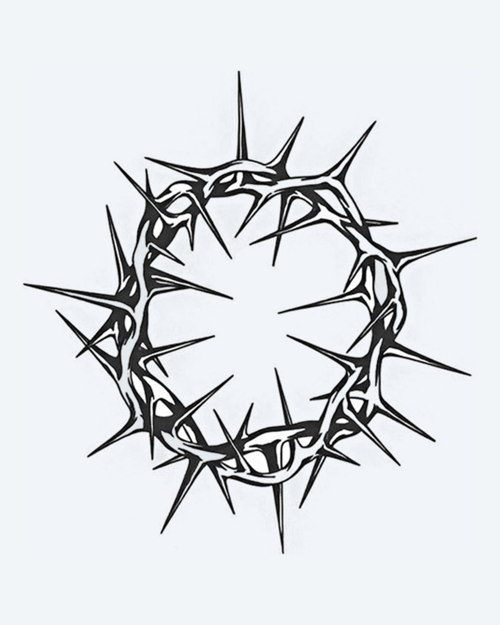 This striking temporary tattoo features a jagged circle of intertwined thorns, each thorn individually detailed for maximum impact. The design symbolizes sacrifice and resilience and offers a bold, minimalist aesthetic with deep emotional undertones.