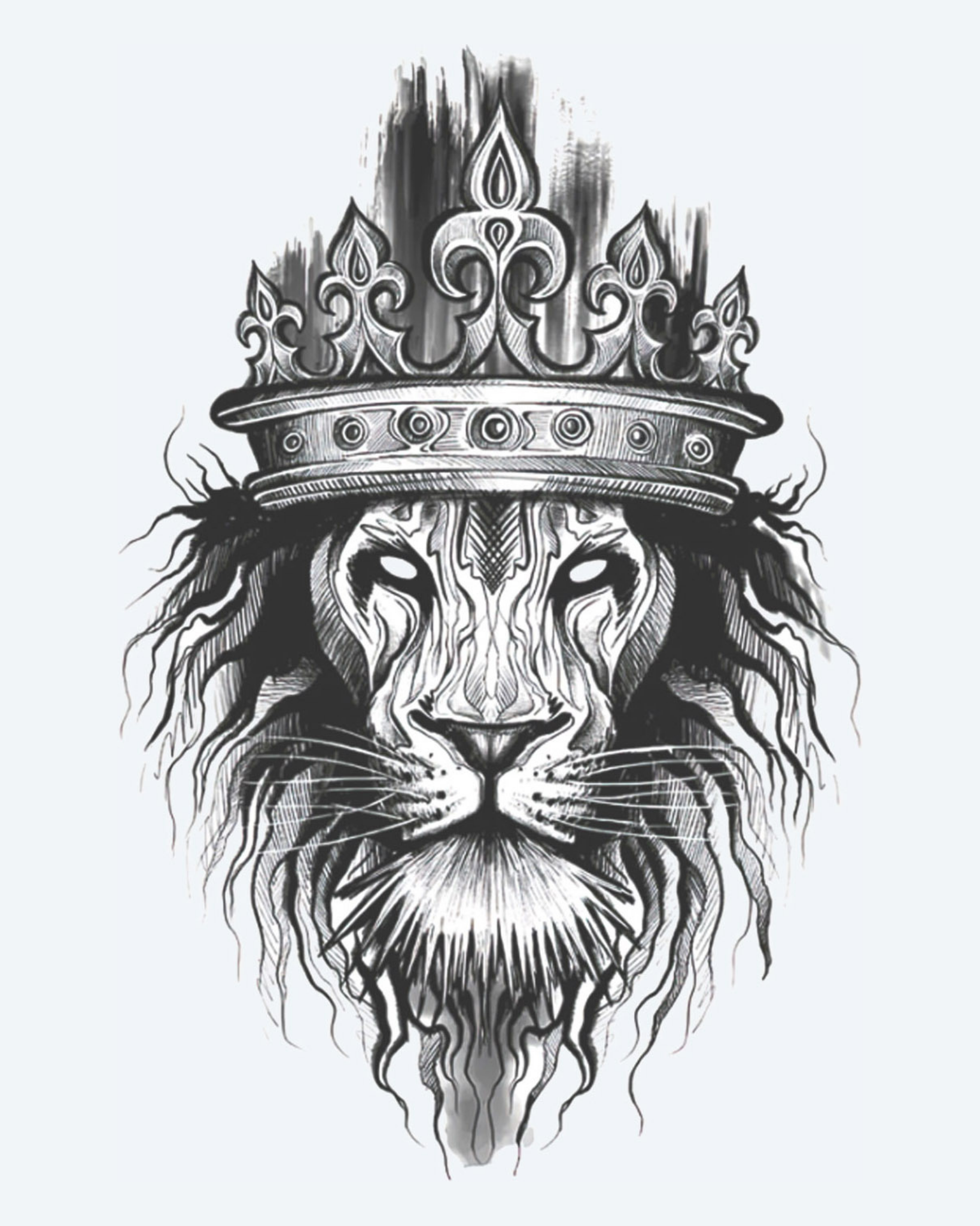 A ferocious lion stares ahead with regal intensity. His flowing mane and ornate crown symbolize strength, power, and leadership. Delicate lines give this design a majestic and commanding presence.