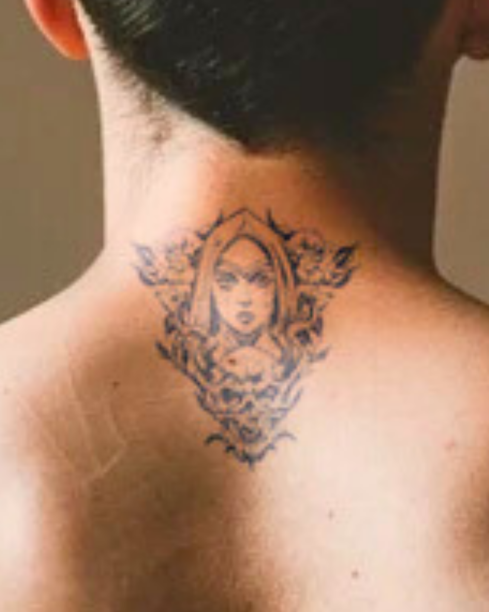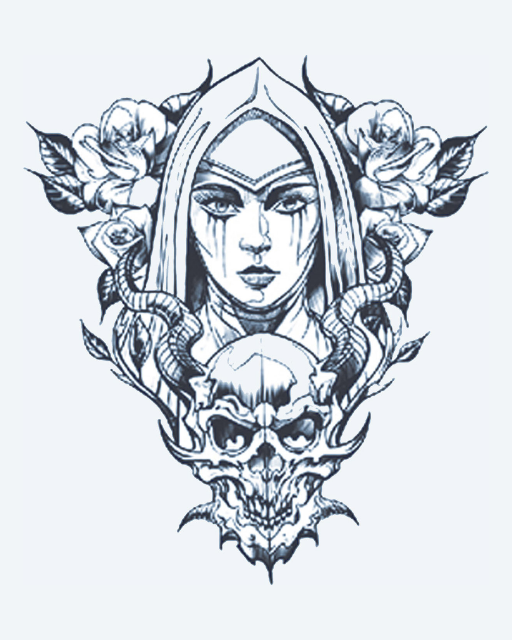 A woman with a solemn expression, surrounded by roses, a skull, and horns. This design symbolizes the balance between beauty and darkness, grief and strength. Perfect for someone who embodies both elegance and resilience.
