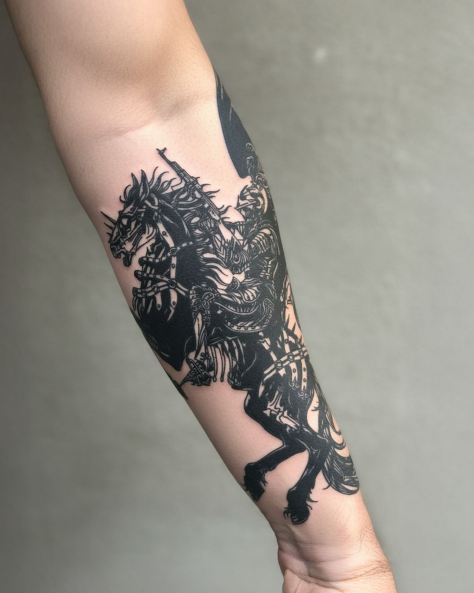 A fierce knight in armor rides a wild horse, holding a weapon high while black wings rise behind him. This bold tattoo in gothic style shows power, battle, and unstoppable strength.