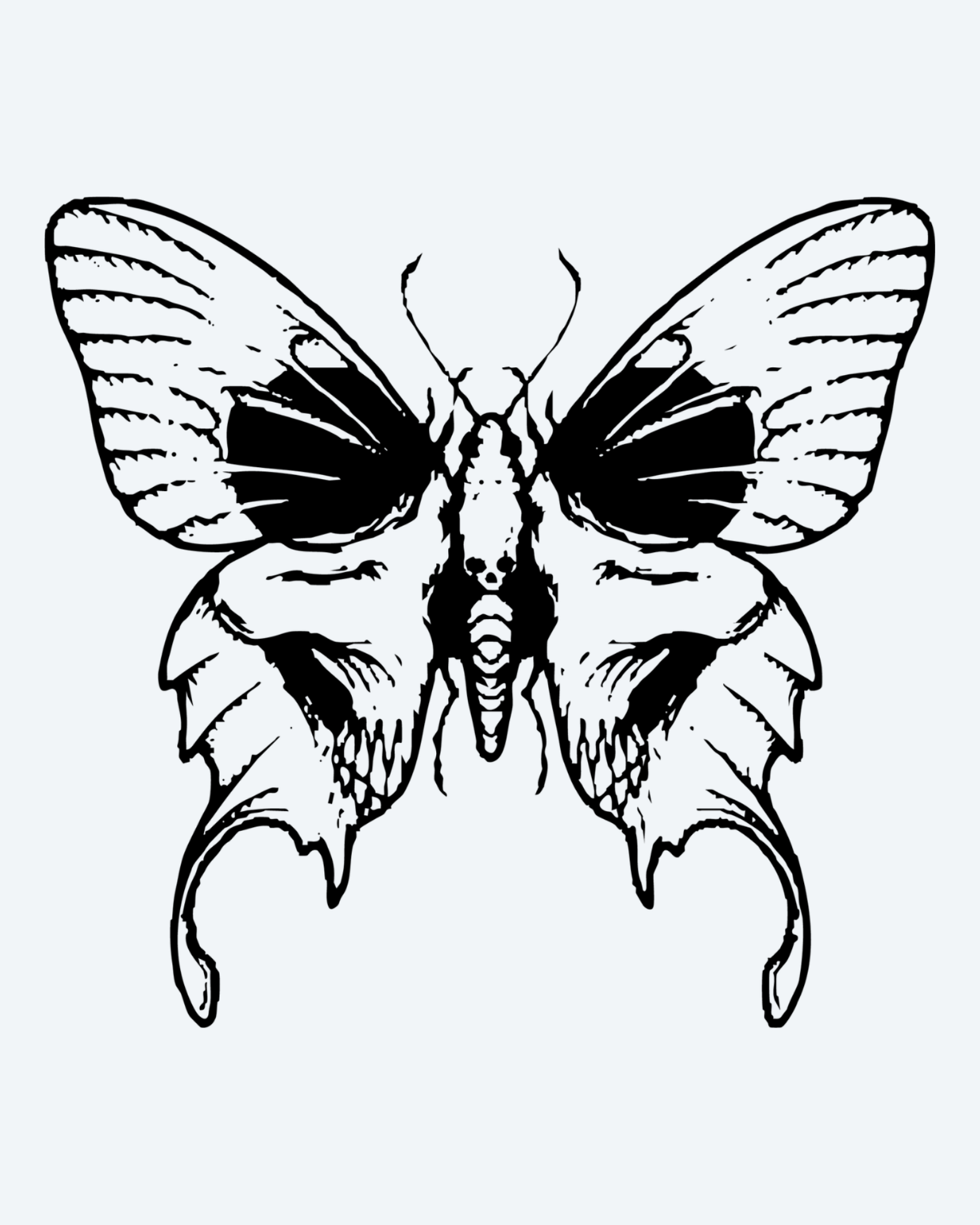 A bold blackwork tattoo of a moth with wings shaped like skulls. It mixes beauty and darkness, telling a story of mystery, change, and the link between life and death.
