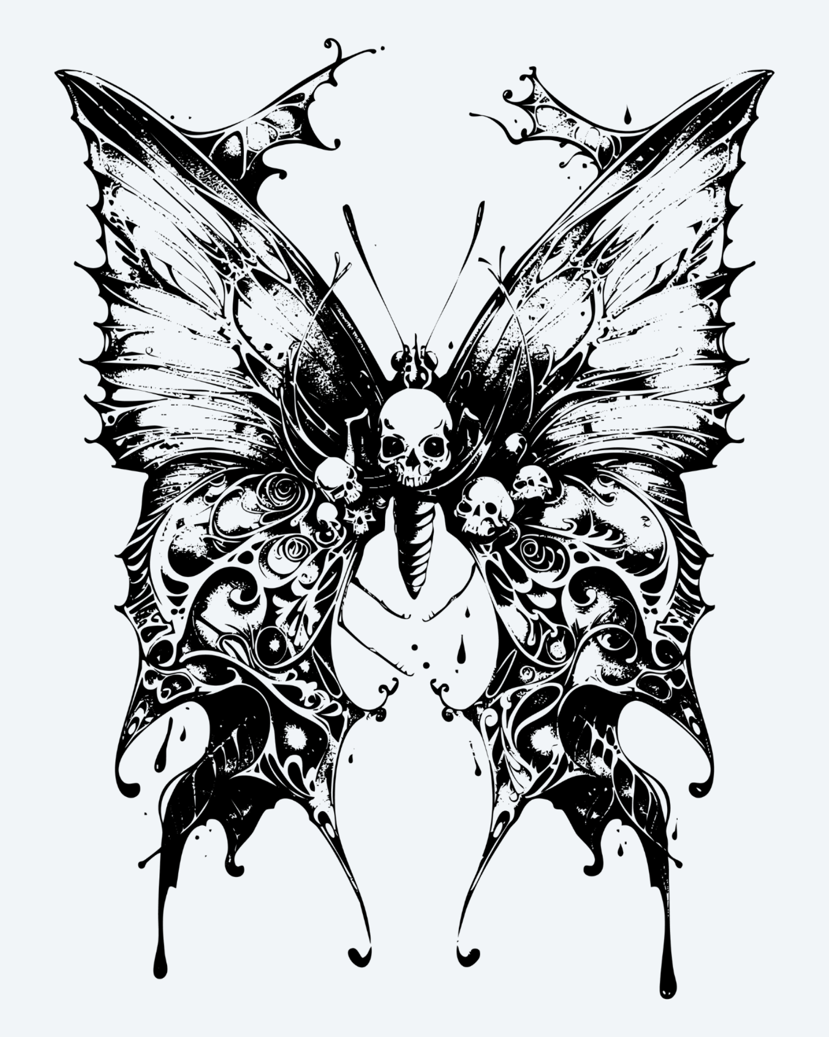 A dark butterfly spreads its wings filled with tiny skulls and swirling patterns. This gothic tattoo mixes beauty and fear, showing how even in darkness, transformation can still take flight.