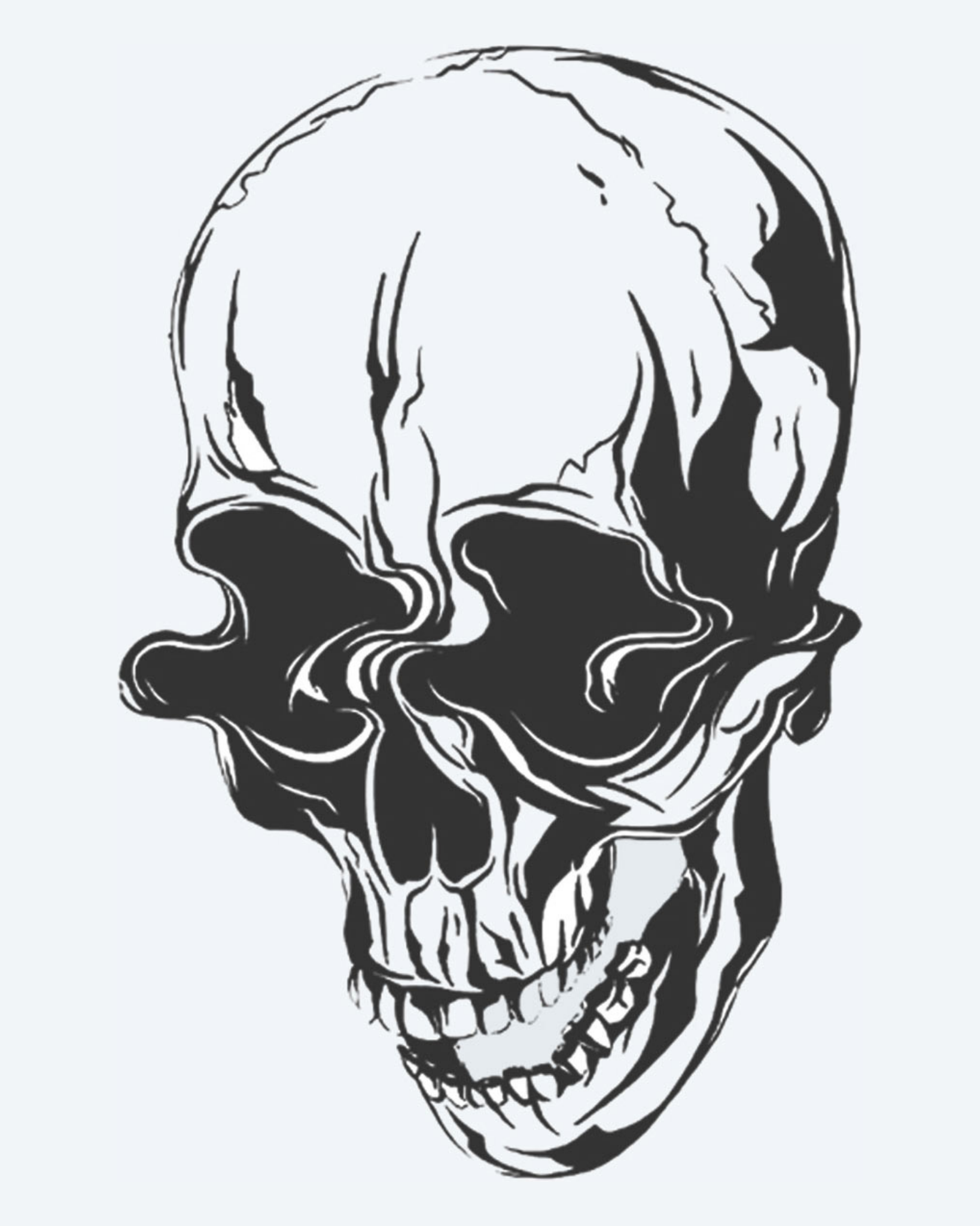 This design is a surreal interpretation of the classic skull. It features fluid, distorted eye sockets and deep shadows that create a haunting, distorted effect. Perfect for bold styles and unusual, unconventional looks.