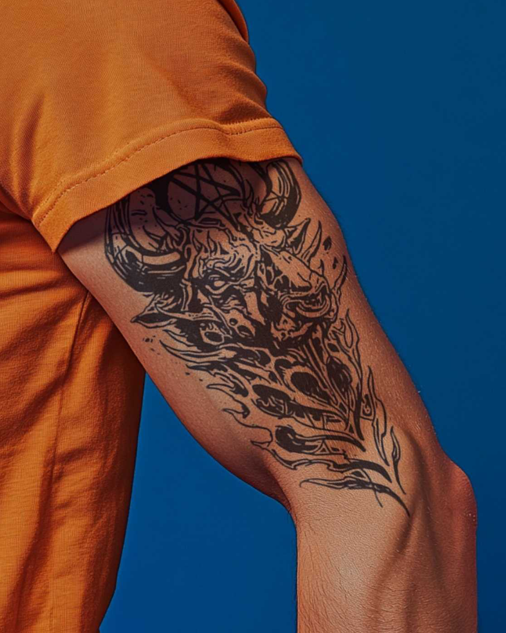 A bull’s head with sharp horns and an ominous pentagram above it, surrounded by chaotic, flowing patterns. This design symbolizes strength, aggression, and rebellion. Perfect for someone who embraces their dark, untamed spirit.