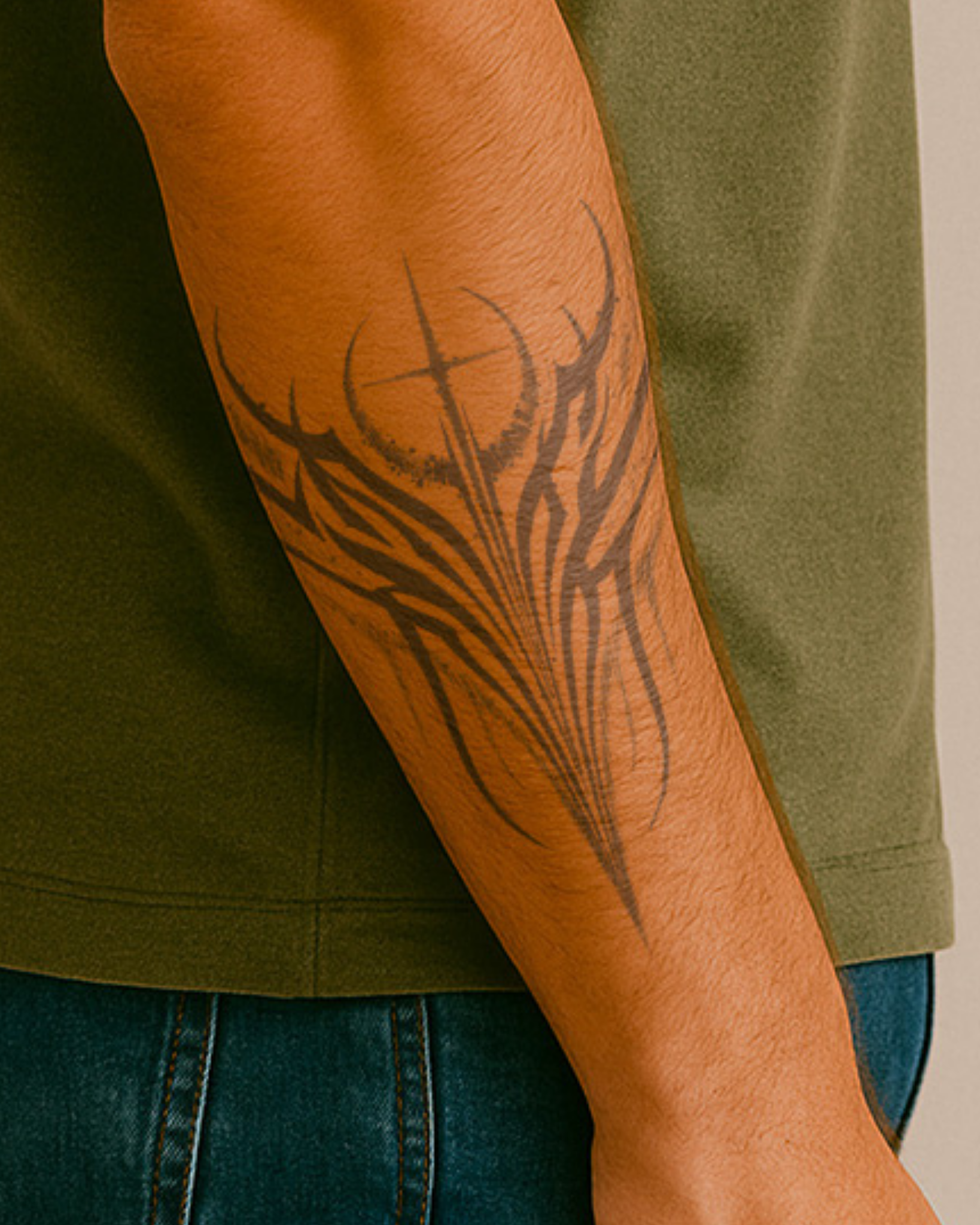 A bold tribal design featuring sharp lines and curves, with a central cross at the top. This tattoo, blends strength and spiritual energy, making it a powerful symbol of faith, protection, and resilience.
