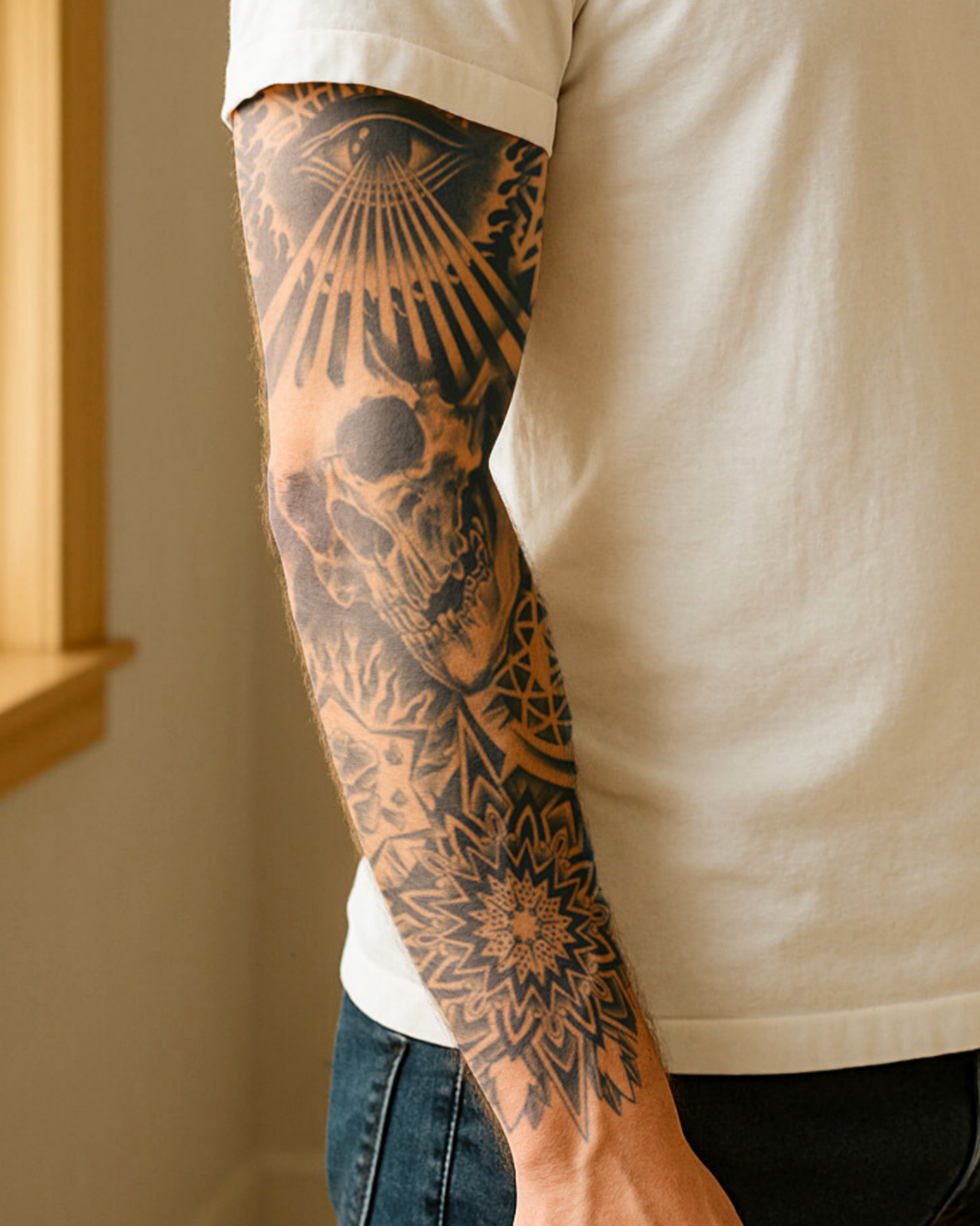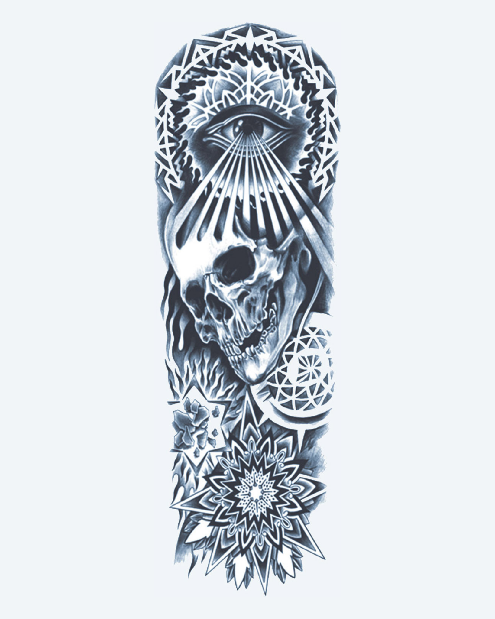This sleeve blends a skull with geometric patterns and an all-seeing eye, symbolizing the connection between life, death, and the divine insight that guides us. The intricate design represents the mysteries of existence and the unfolding of destiny.